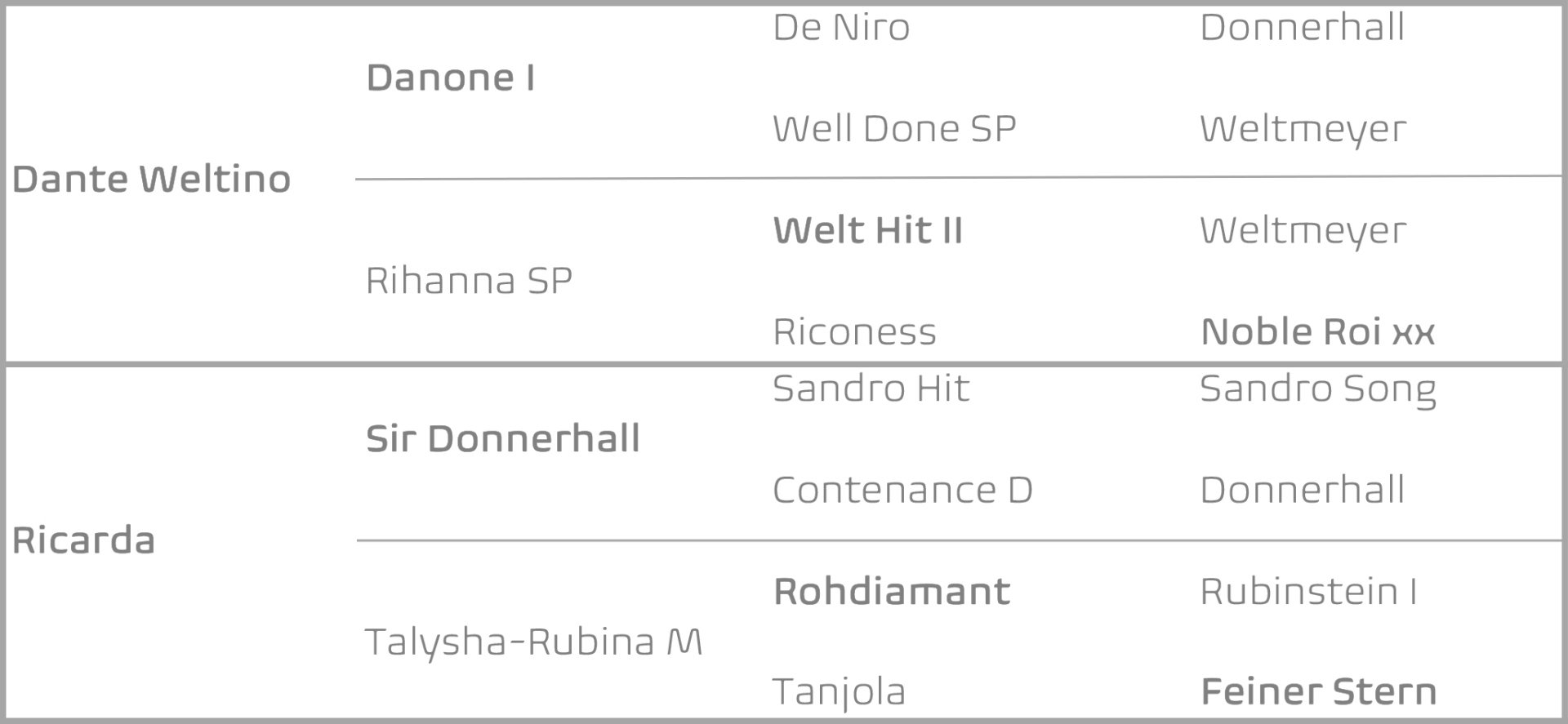 Aus dieser Stute stammt unsere Elitestute Ricarda und Fiderstern. Der Wallach Fiderstern ist erfolgreich im Dressursport unterwegs und kann bereits 16 S-Siege vorweisen.