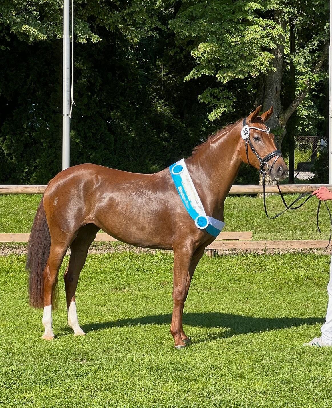 3-jährige Stute von Va Bene aus unserer Elitestute Thania´s Fidertraum (Fidertanz x Rohdiamant x Feiner Stern). Die Fuchsstute befindet sich seit kurzem in der Ausbildung und wird schonend angeritten.