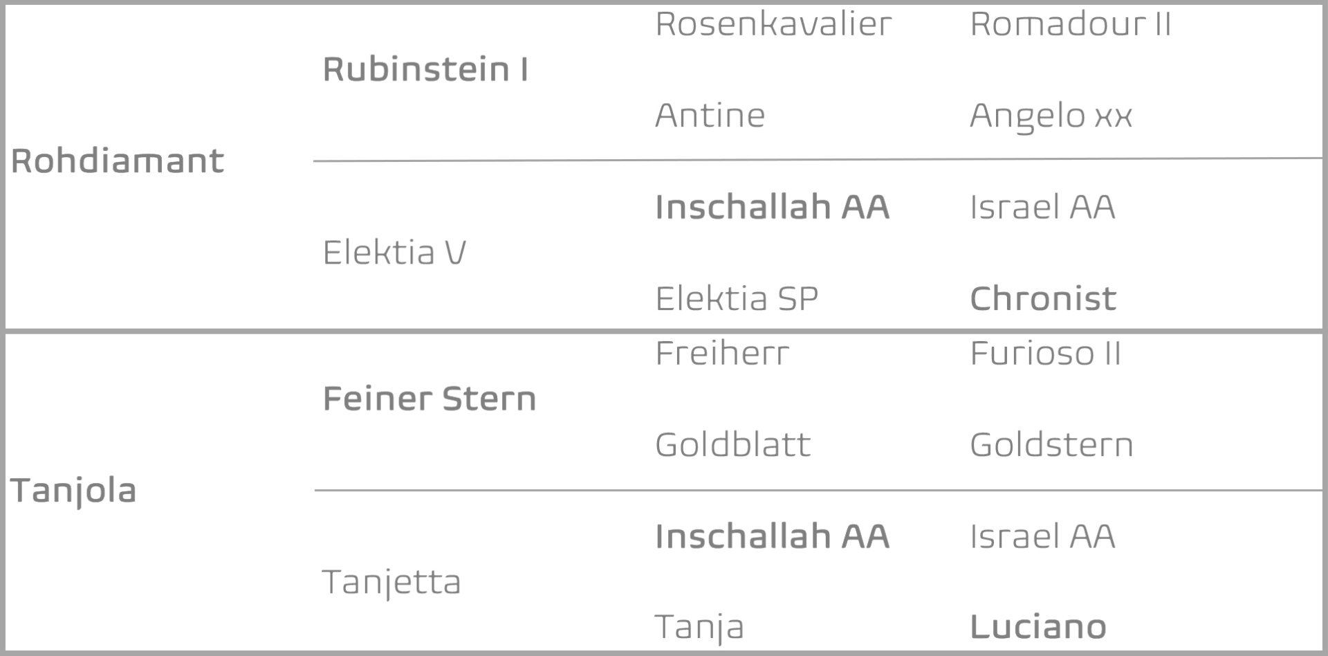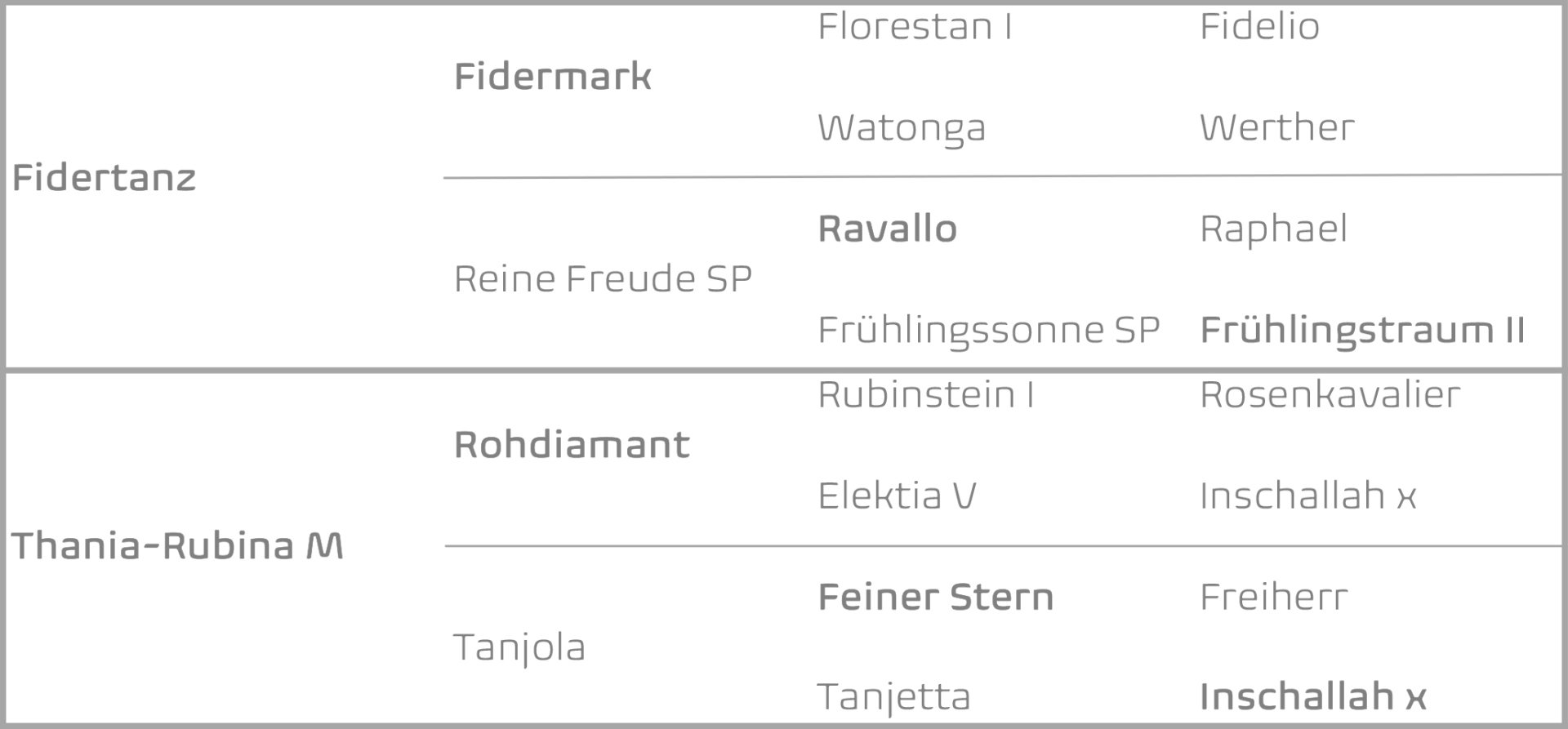 Aus dieser Stute stammt unsere Elitestute Ricarda und Fiderstern. Der Wallach Fiderstern ist erfolgreich im Dressursport unterwegs und kann bereits 16 S-Siege vorweisen.