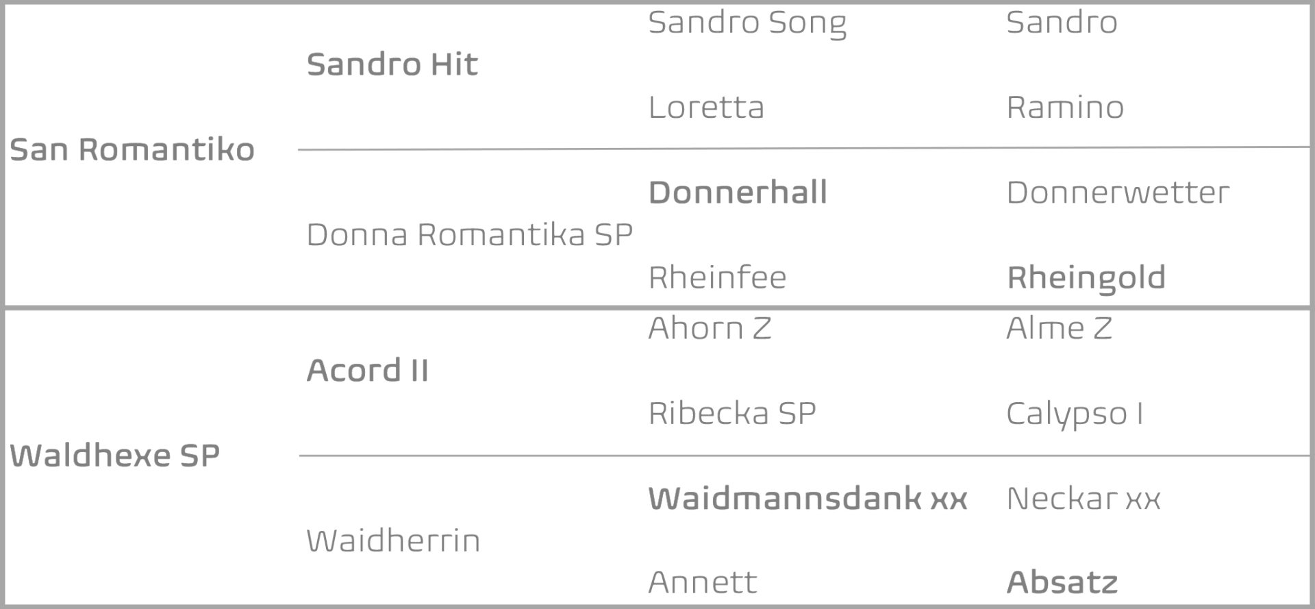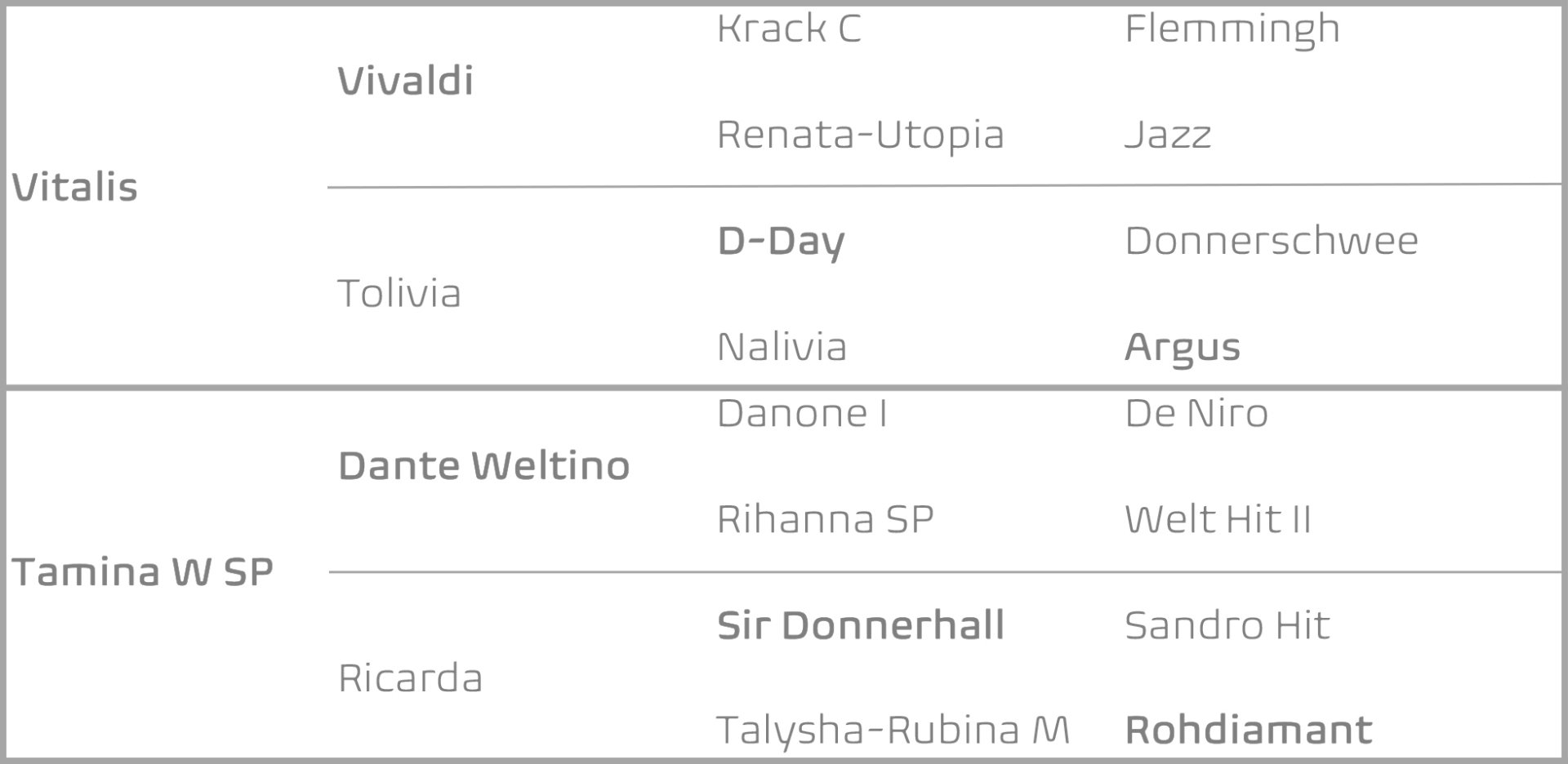 - Tiana W (von Totilas) wurde mit 8,1 ins Stutbuch eingetragen und qualifizierte sich 2023 auf der Landesschau in München-Riem für den Endring.